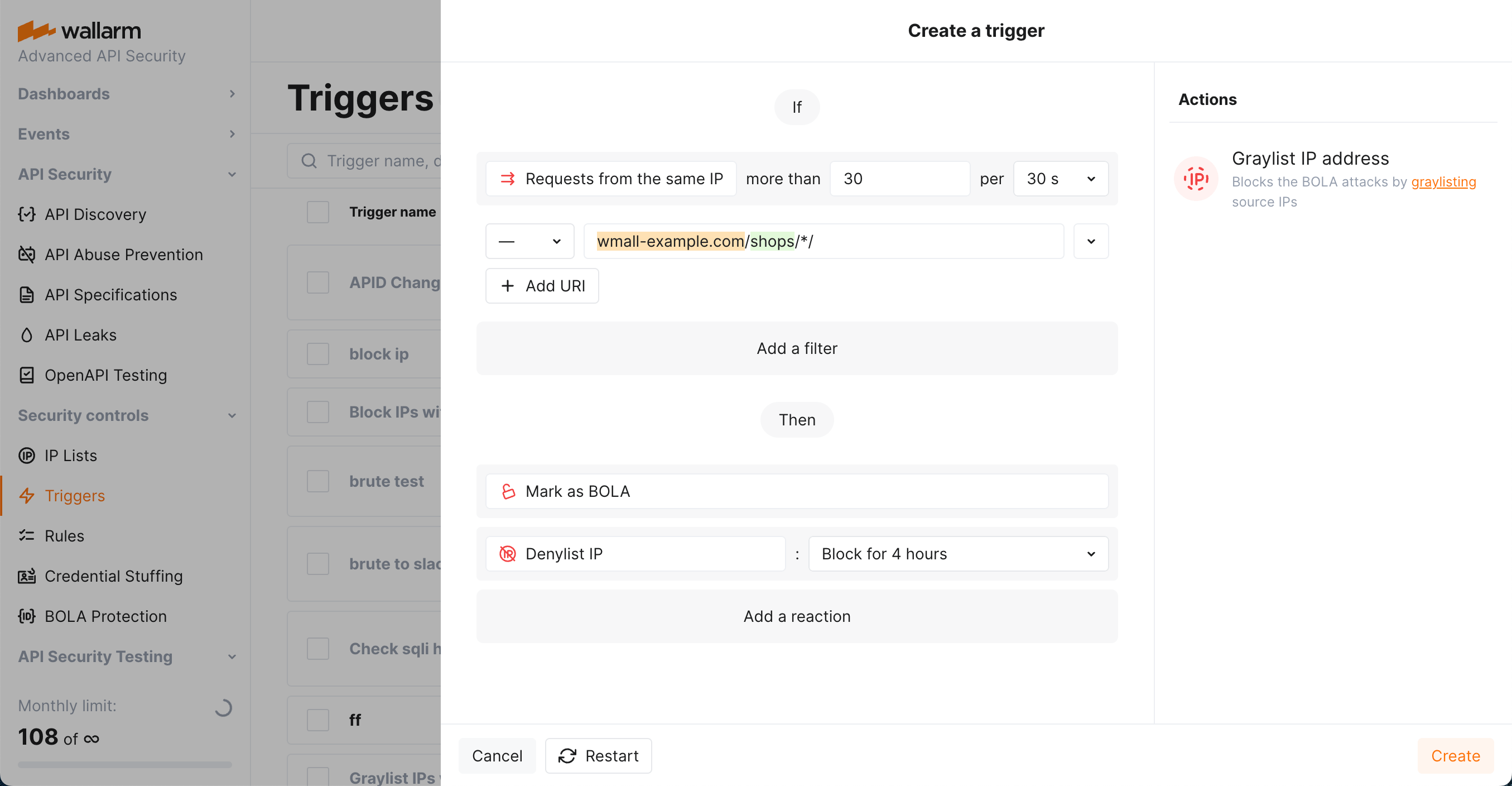 Block for 4 hourtrigger reaction. Wallarm will put origin IP to the denylist after the threshold is exceeded and block all further requests from it.Note that even if the bot IP is placed into the denylist by manual BOLA protection, by default, Wallarm collects and displays statistics regarding blocked requests originating from it.