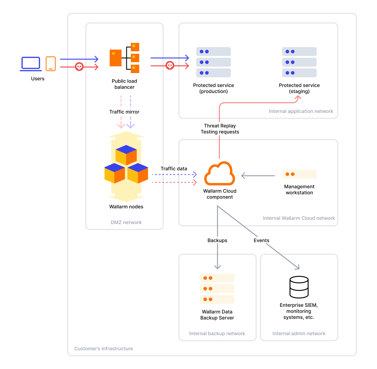 Wallarm offers an on-premises solution tailored for partners, large enterprises, and any organization that requires complete control over their security infrastructure. This deployment model enables hosting both Wallarm Filtering Nodes and the Wallarm Cloud component entirely within your environment.