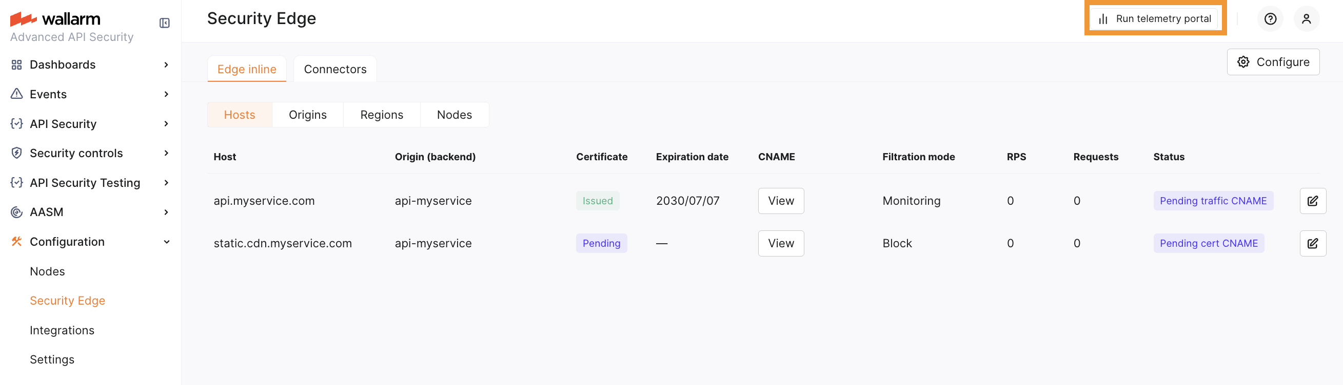 Run telemetry portal once the Node reaches the Active status. It becomes accessible via a direct link from the Security Edge section about 5 minutes after starting.