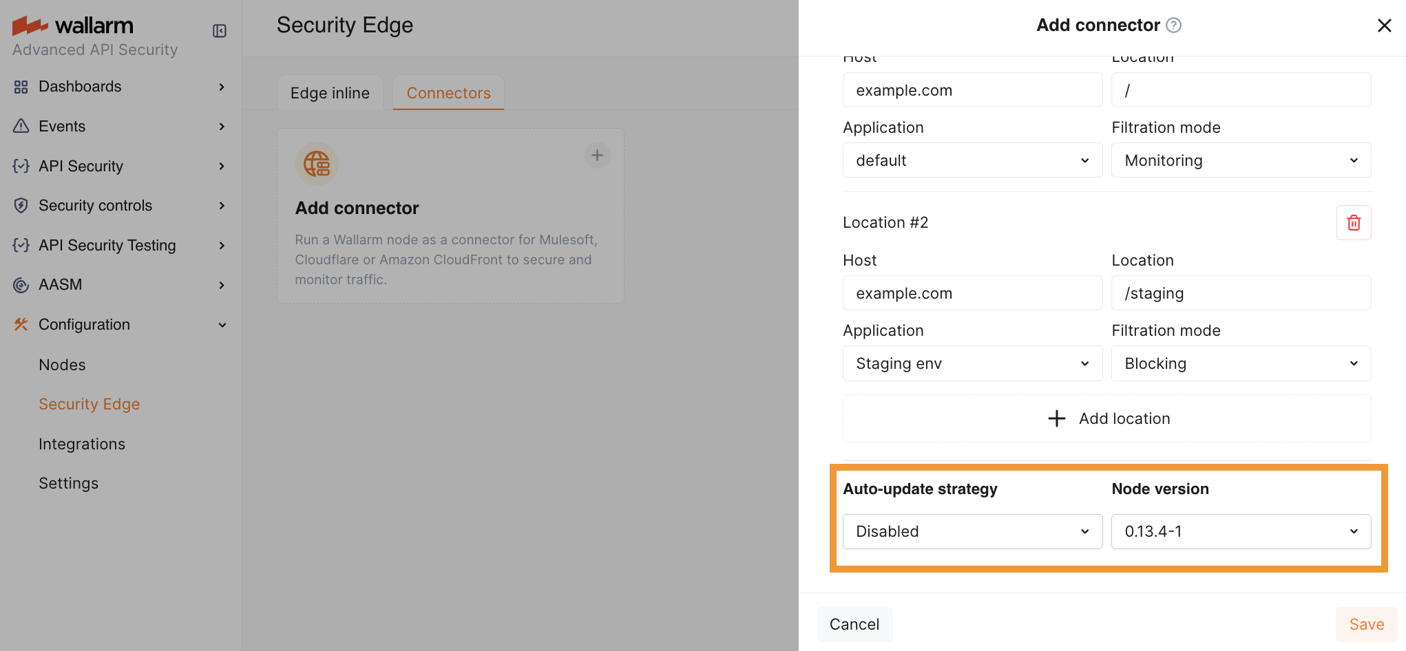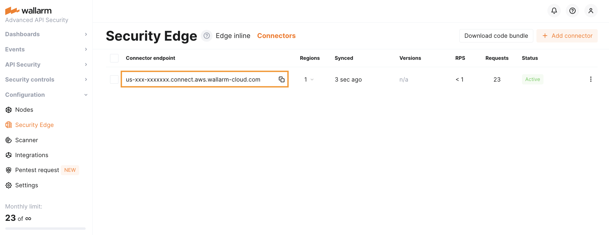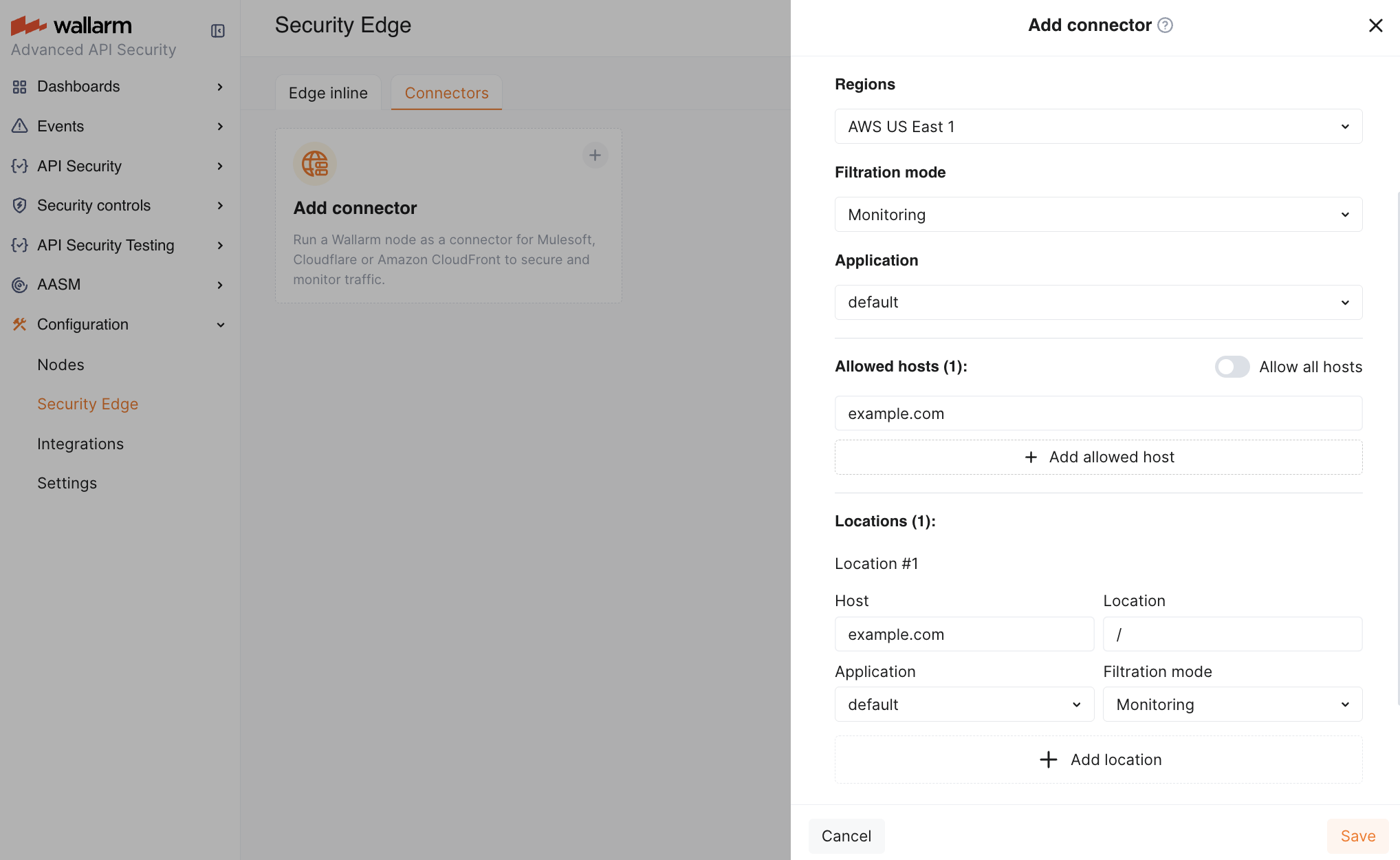 Proceed to Wallarm Console โ Security Edge โ Connectors โ Add connector.