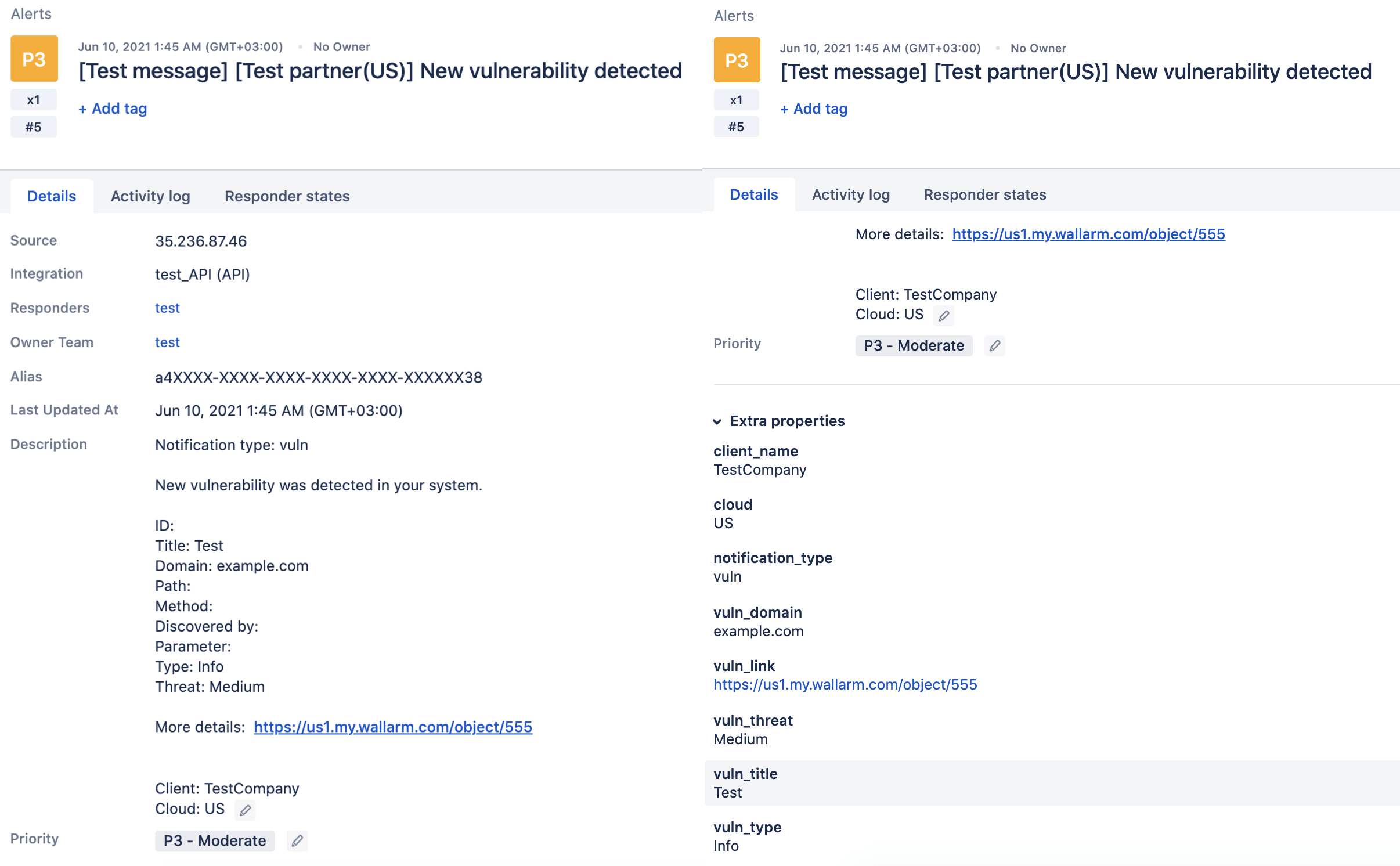 If the attack example is sent to the protected resource, Wallarm will record the incident. Two or more recorded incidents will trigger sending the following notification to Opsgenie: