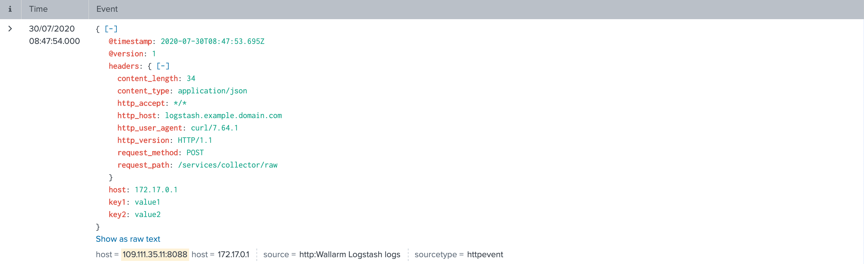 https://109.111.35.11:8088/services/collector/rawvia POST requests. To authorize requests, the HTTPS Event Collector token is used - Logstash logs are additionally printed on the command line (15th code line). The setting is used to verify that events are logged via Logstash