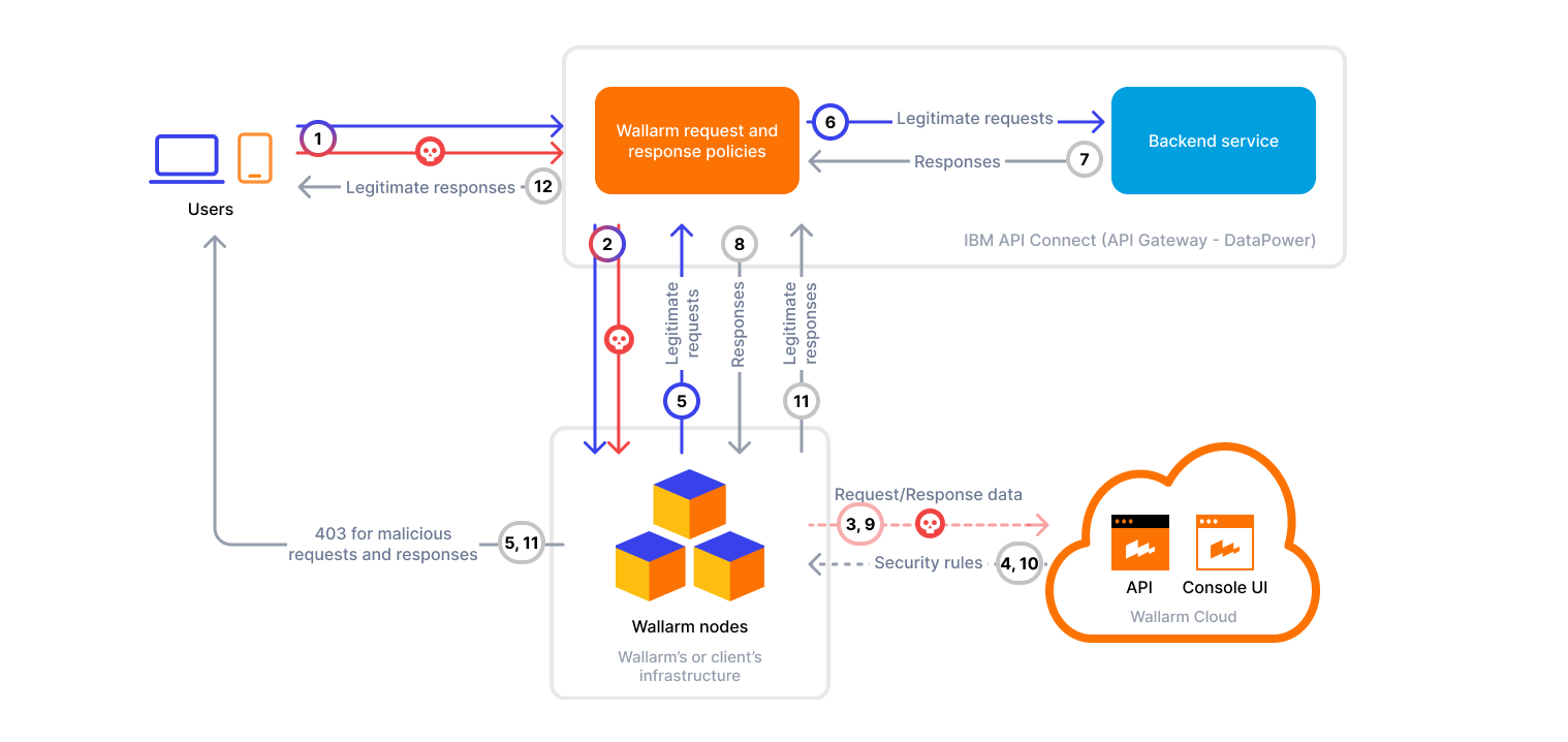 IBM API Connect is a full lifecycle API management solution that includes tools for creating, securing, managing, and monitoring APIs. Wallarm can be used as a connector to protect APIs managed through IBM API Connect by inspecting API traffic and mitigating malicious requests.