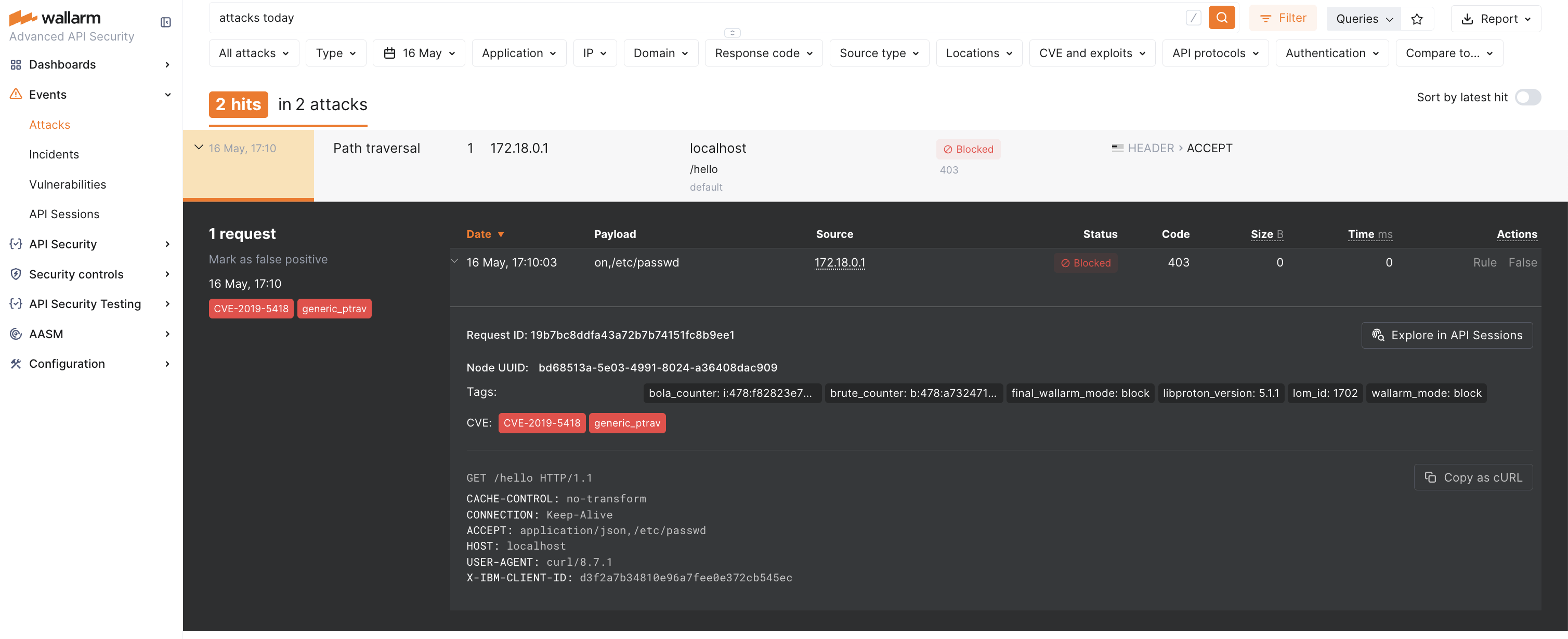 If the Wallarm node mode is set to blocking and the traffic flows in-line, the request will also be blocked (the screenshot demonstartes this case).